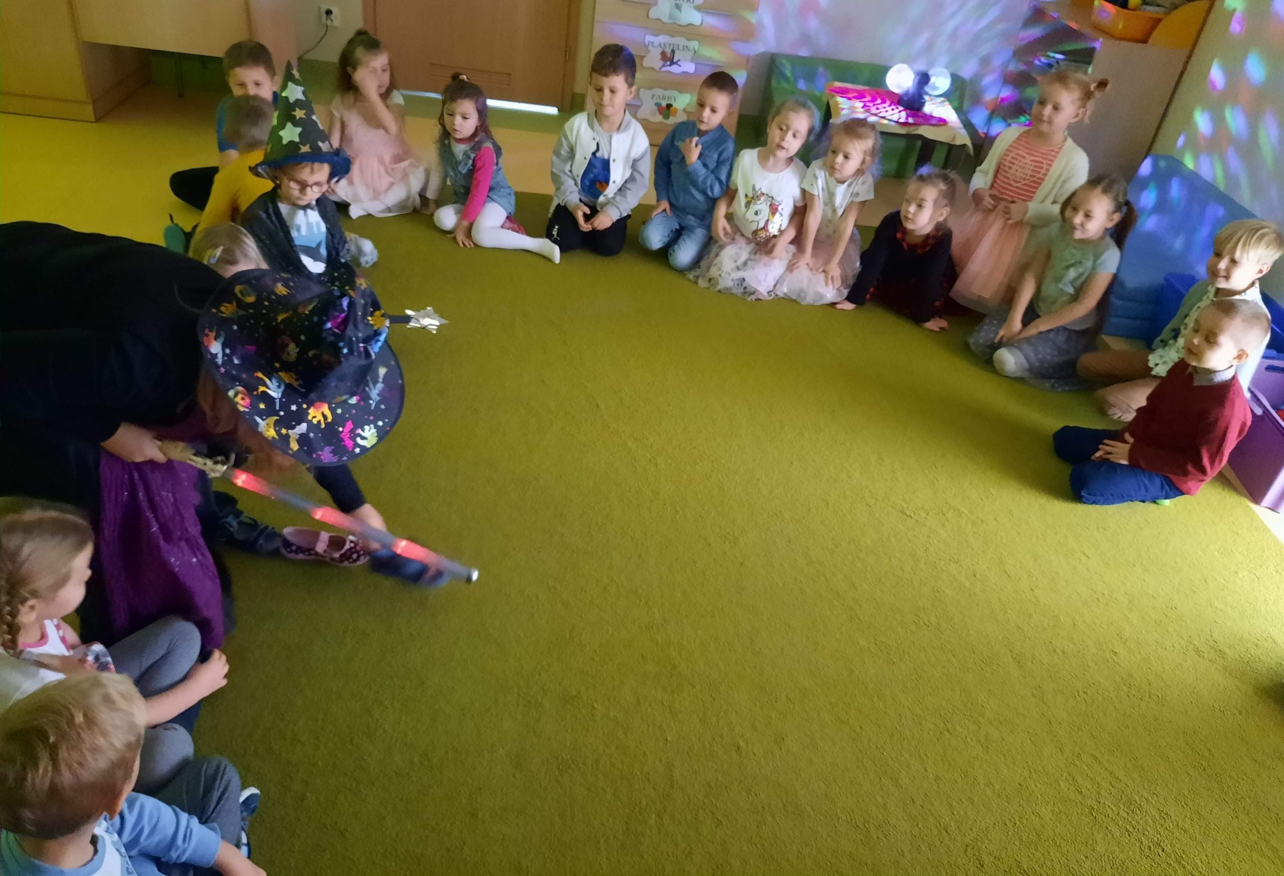Magiczny czas w piątek nastał u Czterolatków i Pięciolatków. Odwiedziła bowiem ich grupy wróżka. Korzystając ze swojej magicznej różdżki wyczarowała muzykę disco i wywróżyła przyszłość przedszkolakom. Na stoliczkach w tajemniczy sposób pojawiły się pyszne soczki i ciasteczka. Dzieci przeżyły magiczny czas.