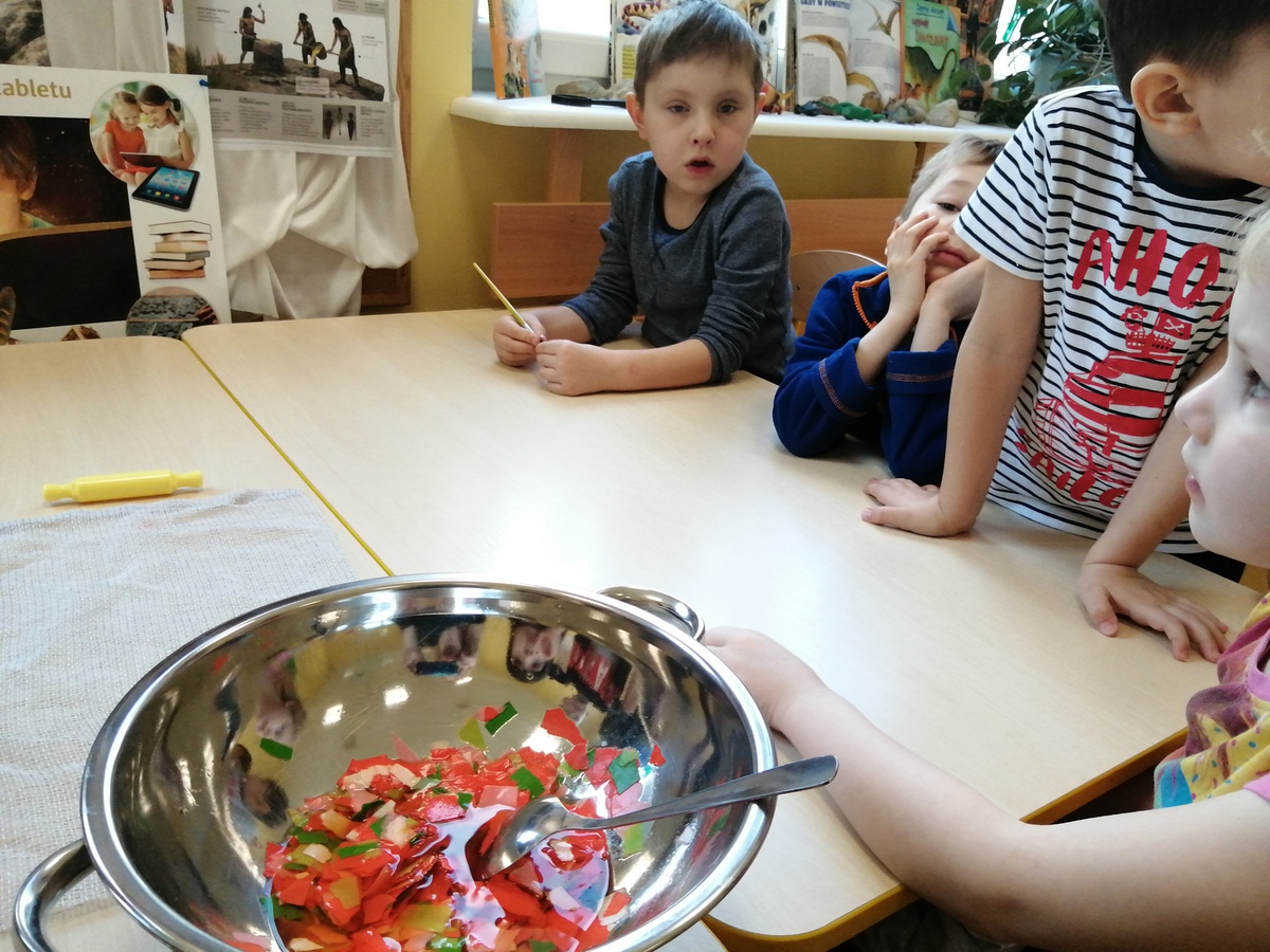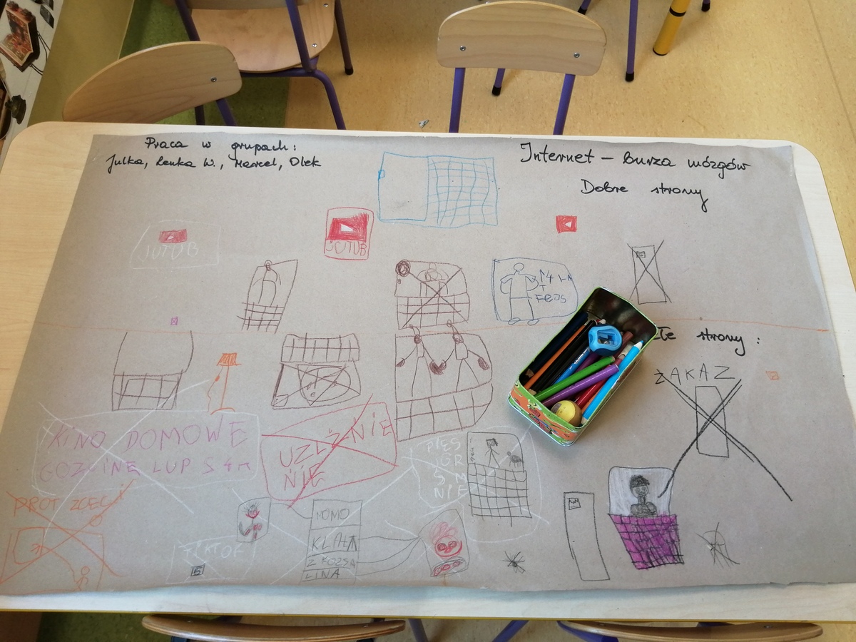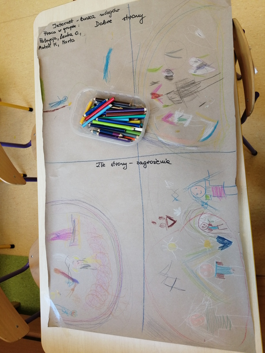 W ramach tygodnia na temat wynalazków dwie najstarsze grupy wykonywały różne eksperymenty. Omawialiśmy też dobre i złe strony internetu i multimediów z „burzą mózgów” dzieci na czele. W ramach zajęć koleżeńskich, te dwie grupy z podziałem na zespoły pracowały nad plakatami przedstawiającymi te cechy. Omawialiśmy to również z uwagi na Dzień Bezpiecznego Internetu, by przestrzec przedszkolaków przed zagrożeniami płynącymi z tego źródła.