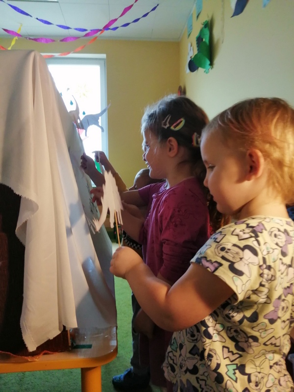 W ramach programu pani Sylwia przedstawiła dzieciom teatrzyk cieni pt. „Bolek i Lolek poznają dinozaury”, do którego zaprosiła również dzieci z grupy Zdobywców. Po teatrzyku była krótka prezentacja poznanych dinozaurów oraz teatrzyki cieni w wykonaniu dzieci. To było dla nich ciekawe przeżycie.