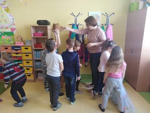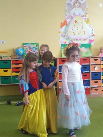 W tygodniu dotyczącym teatru dzieci z rupy Wynalazców miały okazję poczuć się jak prawdziwi aktorzy. Bogaty kącik kostiumów pozwolił przeistoczyć się w różne osoby i postacie. Ewentualne braki w kostiumach tj. maski czy korony dzieci wykonywały samodzielnie wg własnego pomysłu i uznania. Stworzyliśmy też scenę do gry kukiełkami i pacynkami, gdzie dzieci mogły swobodnie improwizować. Nasze talenty podziwialiśmy nawzajem oraz zaprosiliśmy kolegów i koleżanki z grupy Poszukiwaczy, dla których przygotowaliśmy także występy. Miłą niespodziankę zrobiła pani Asia, która własnoręcznie wykonaną pacynką i kukiełką przygotowała występ niespodziankę.