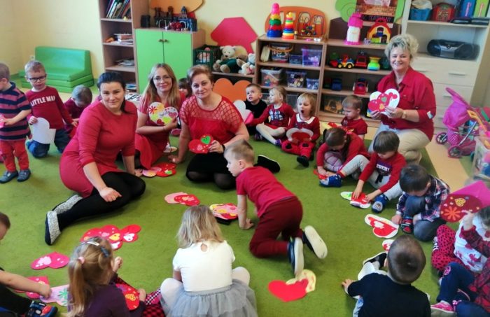 Najmłodsze grupy po raz pierwszy obchodziły Walentynki. Najpierw z pomocą pań przygotowywały wielkie czerwone serca dla swoich kolegów i koleżanek, pań, innych grup i rodziców. Następnie wrzucaliśmy wszystkie walentynki do wielkiej poczty walentynkowej, by 14 lutego w Dzień Walentego, otworzyć pocztę i cieszyć się miłością i sympatią między sobą. Dzieci otrzymały od swoich pań wielkie, balonowe serca i czekoladowe przysmaki. Wszystkie dzieci wyszły z przedszkola z uśmiechami na twarzy.