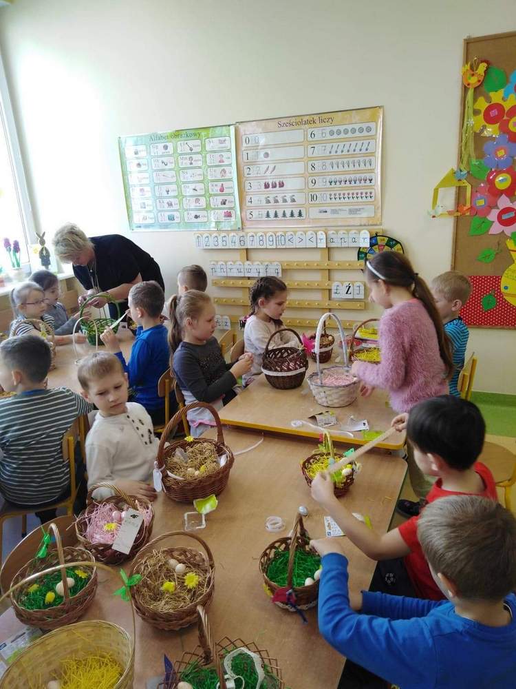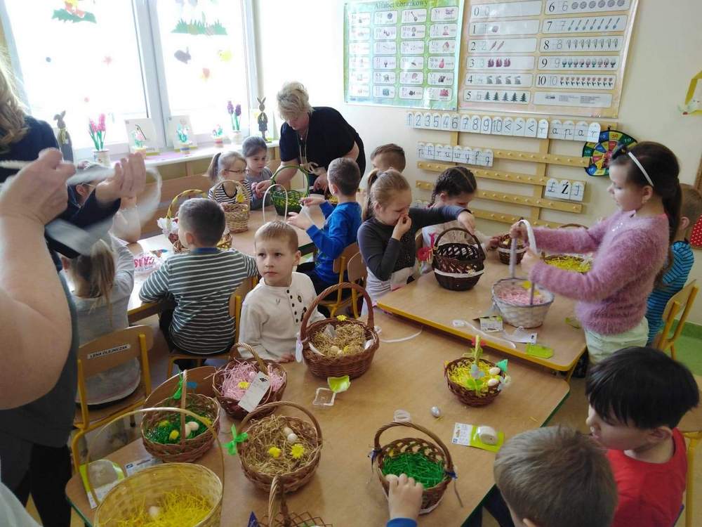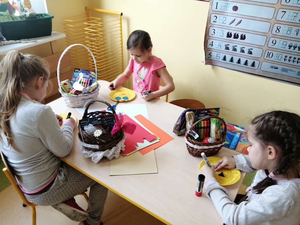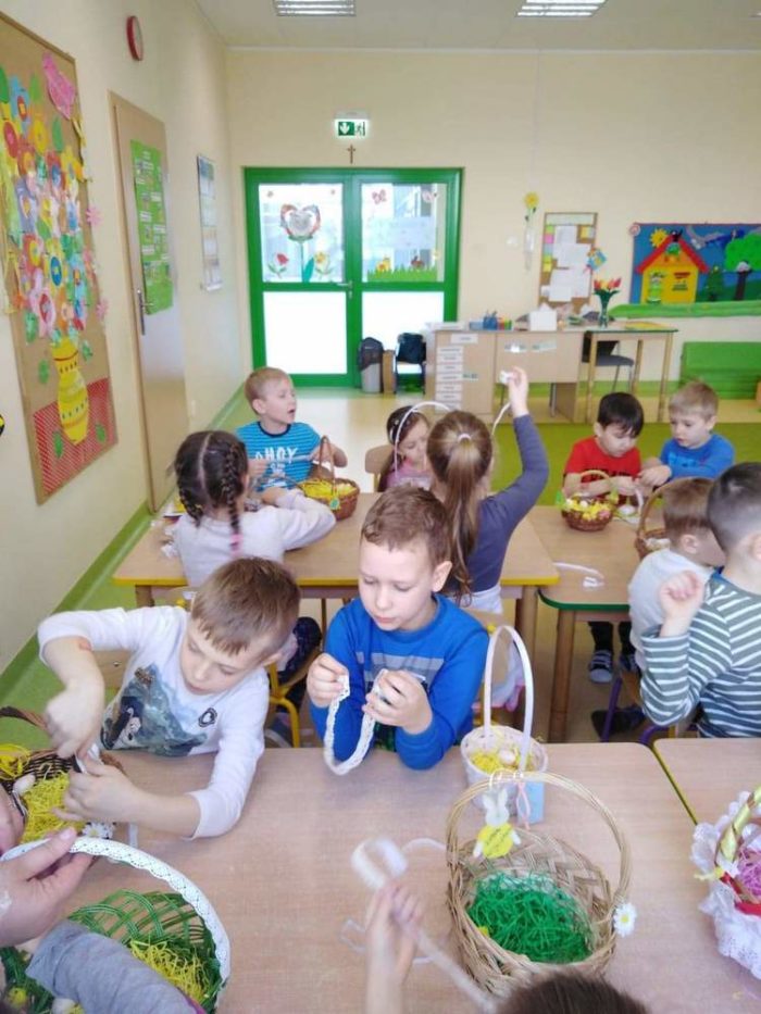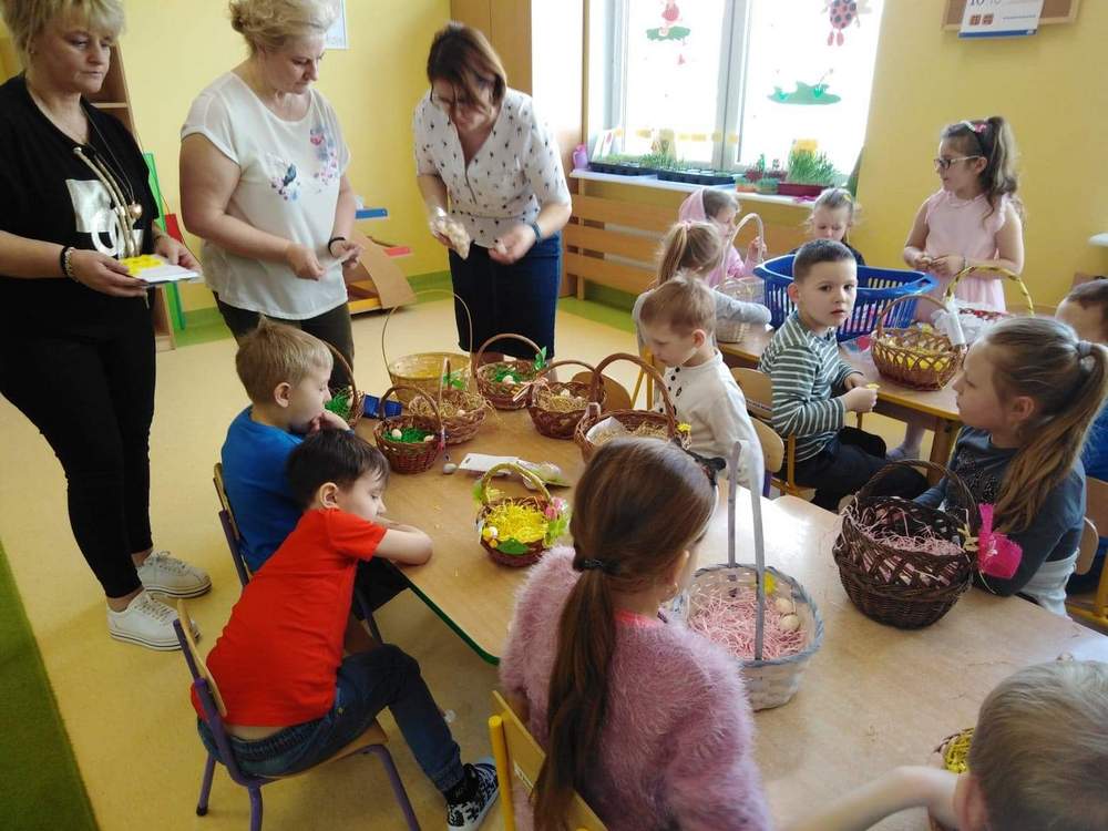 Zajączek w tym roku przykicał troszkę wcześniej. Wcześniej były oczywiście przygotowania, dzieci ozdabiały koszyczki, do których zając miał przynieść prezenty. Przedszkolaki szukały zająca i pytały spotkane osoby, czy gdzieś nie przebiegał. Niespodzianka czekała na nich w przedszkolu, zając wskoczył przez okno. Radość była wielka.
